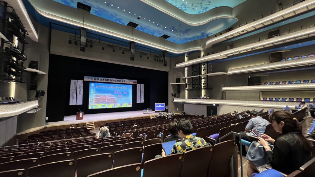 : 翌日土曜日は本番の発表!朝は6時には起きて!用意して7時30分くらいには、ホテルから歩いて学会会場「那覇文化芸術劇場なはーと」へ!開場が8:15でしたが30分前には到着!多くの学会員が集まっていました!蒸し暑く皆んな早く開場しないかと!待ってました!とにかく蒸し暑かったです!