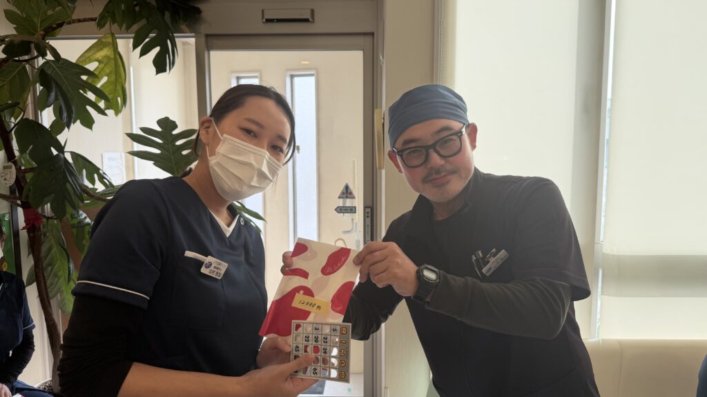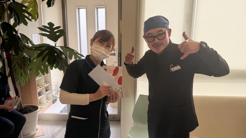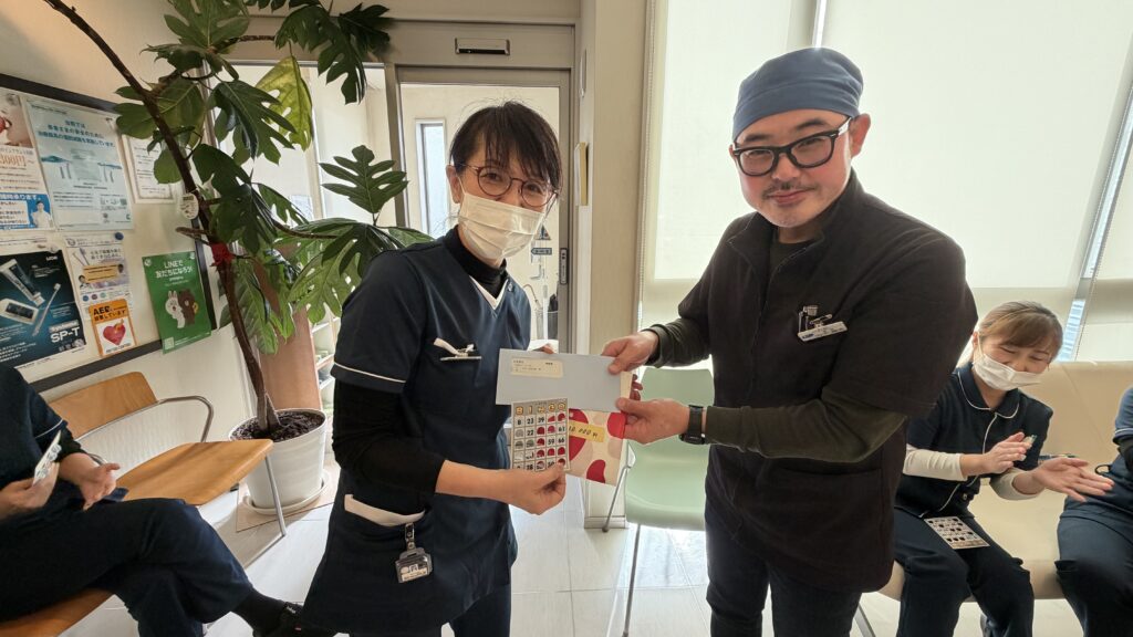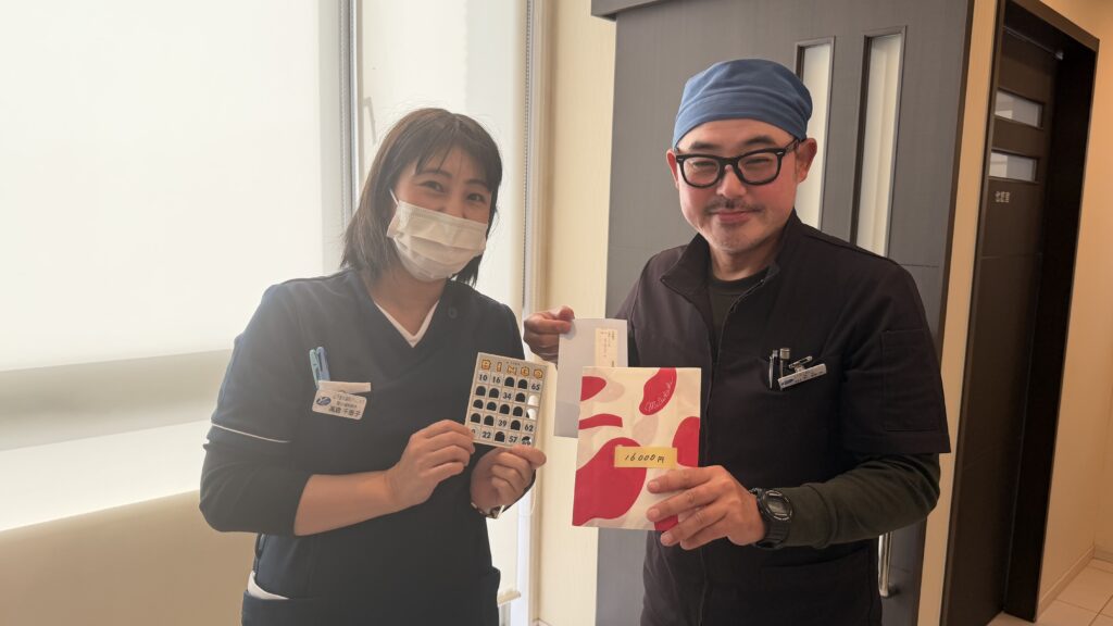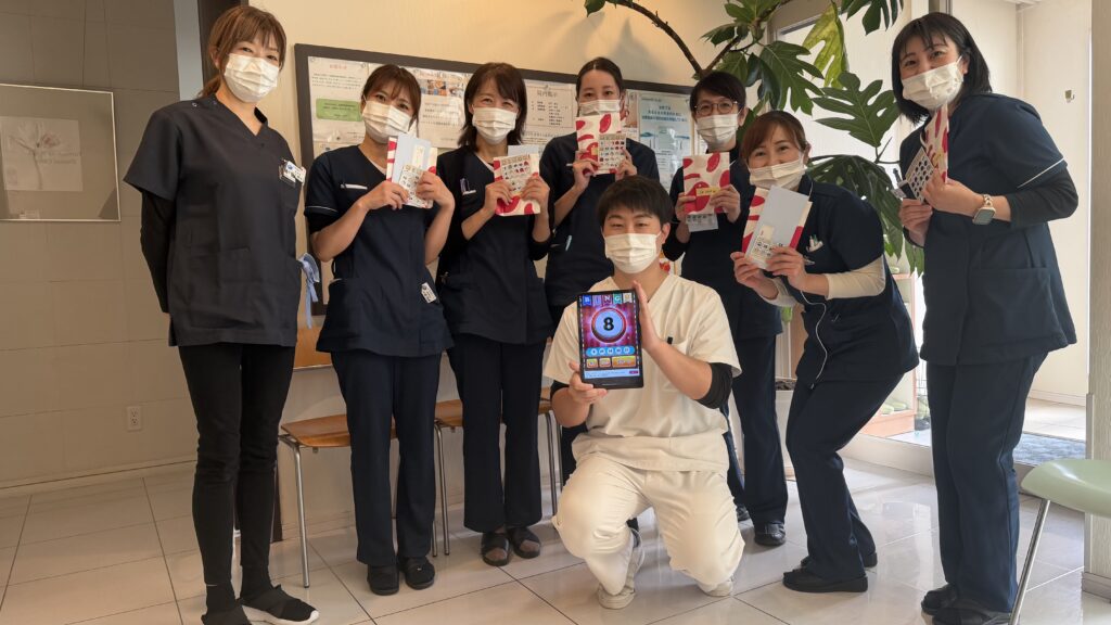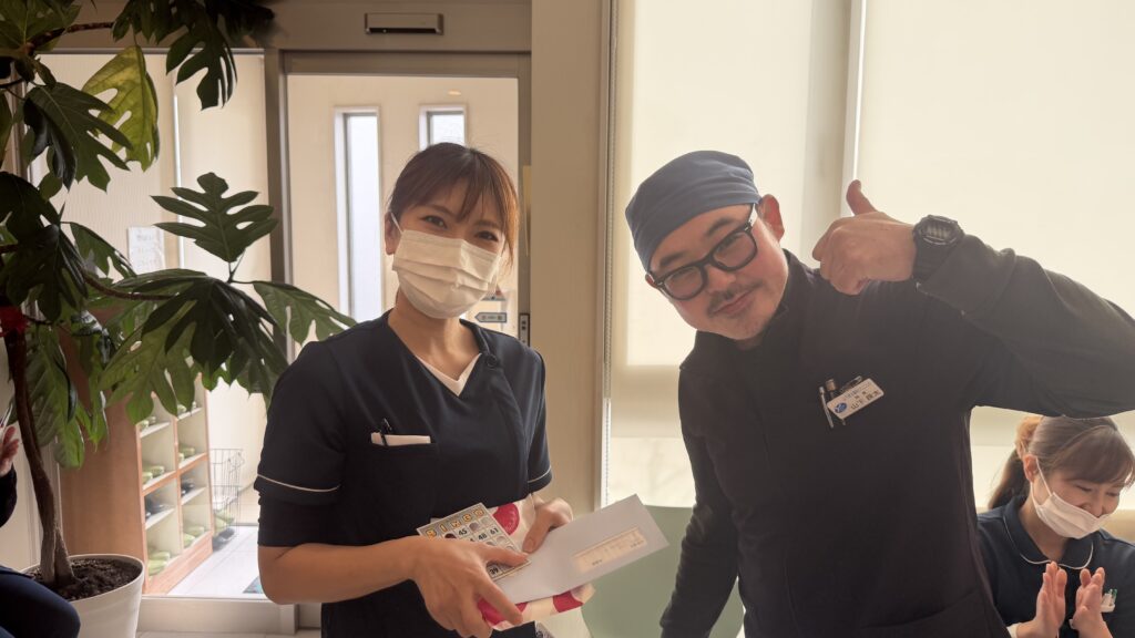 先週の木曜日のクリスマスに毎年恒例のビンゴ大会を行いました!今年もスタッフに支えられて頑張っていけました!感謝しかありません!いつもありがとうございます!感謝を込めてのビンゴ!大会!大いに盛り上がりました!今年の1位は毎回最下位が続いていた歯科衛生士の財津さん!おめでとうございます!