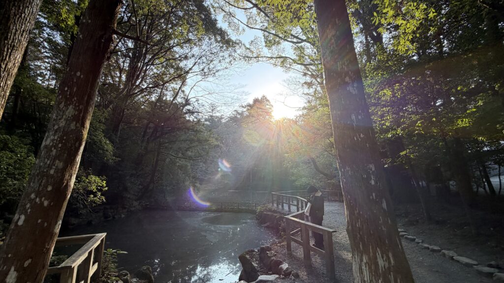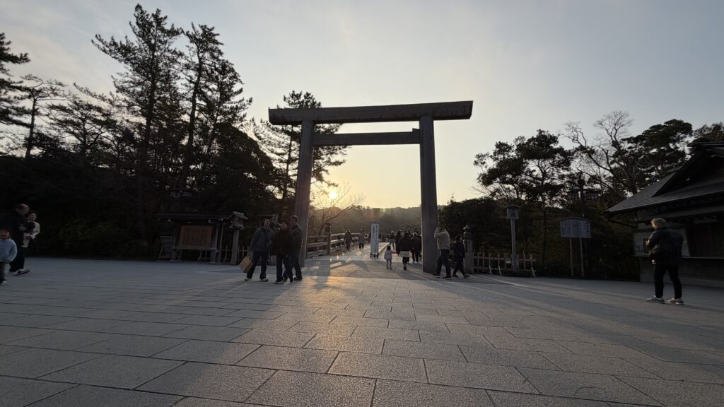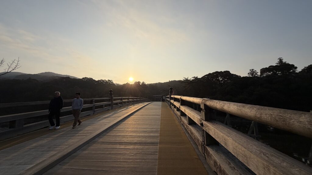 翌日は早起きして内宮へ!バスで移動!朝日と宇治橋前鳥居と!