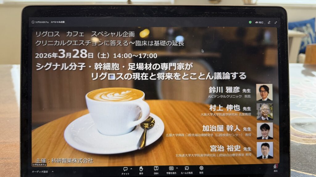 先週末の土曜日は診療終了後は、14時から3時間Webセミナーを受講しました!最近の知見をわかりやすく講義して頂き大変勉強になりました!今まで私がやってきた歯周組織再生治療、GBRの確認、新しい学びがあり今後の臨床に活かせることができる有意義なセミナーでした!ありがとうございました!お題は「シグナル・幹細胞・足場の専門家がリグロスの現在と将来をとことん議論する」歯周病治療、インプラント治療には必要な知識がブラッシュアップできて良かったです!